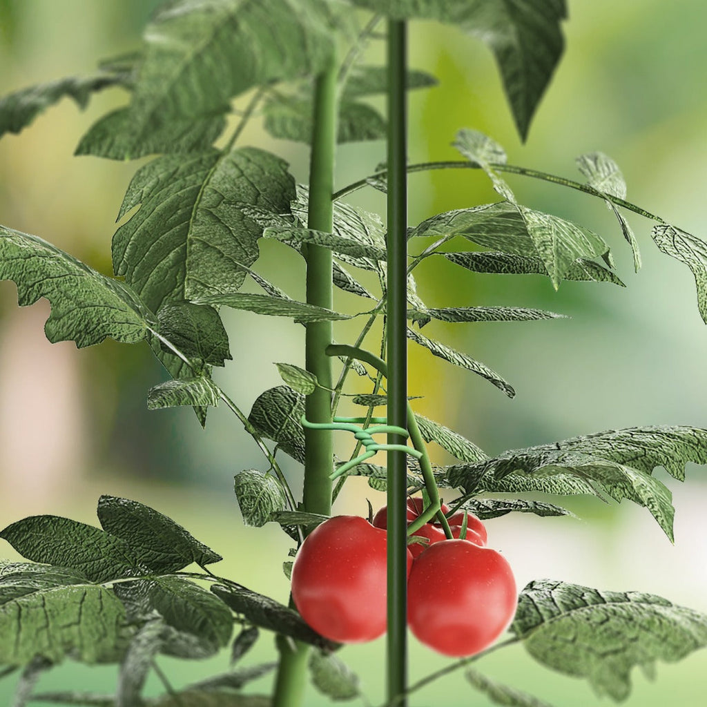 A set of heavy-duty wire fasteners designed to hold plants up together with stakes, grids, posts, and other support systems. Each bundle of green plant ties is made of an iron string core enveloped in a dense, heavy-duty PE plastic that is easy to shape.