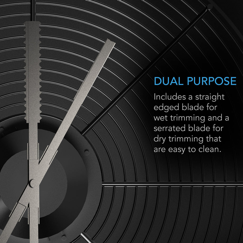 - Includes a quadruple-edged straight blade for wet trimming and a serrated blade for dry trimming.