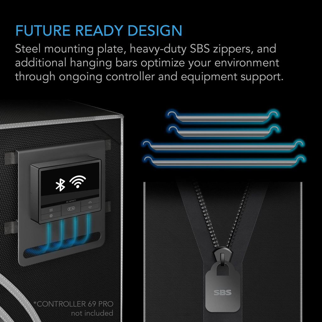 Accessories include a waterproof floor tray, a detachable tool bag, additional roof hanging bars, and a mounting plate to install your controller onto the grow tent.