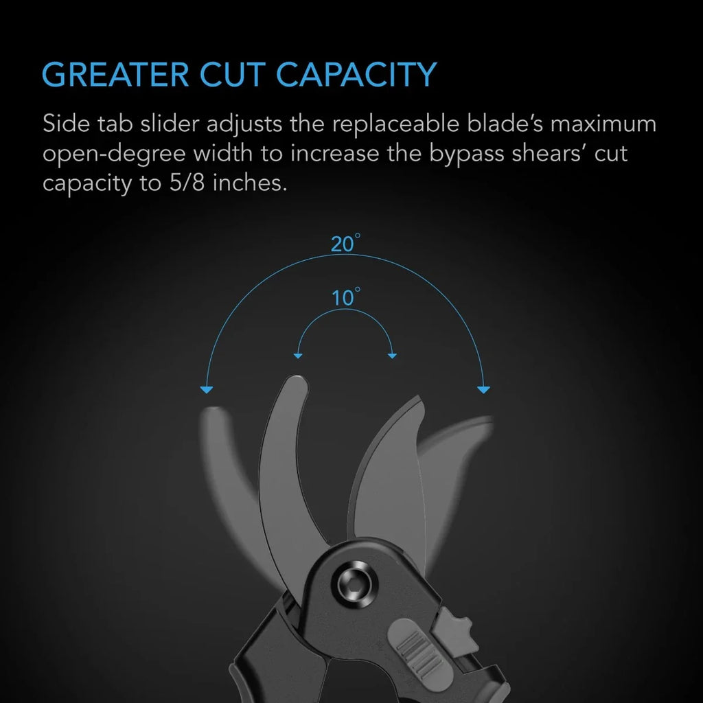 The drop-forged bypass blade is crafted with stainless steel, using a Teflon coating to reduce resin build-up and jamming. A sliding lock mechanism securely keeps the pruning shears closed, which provides protection for the blade and your hands. Additionally, the side switch toggles how wide the blade opens to increase cut capacity to 5/8 inches.